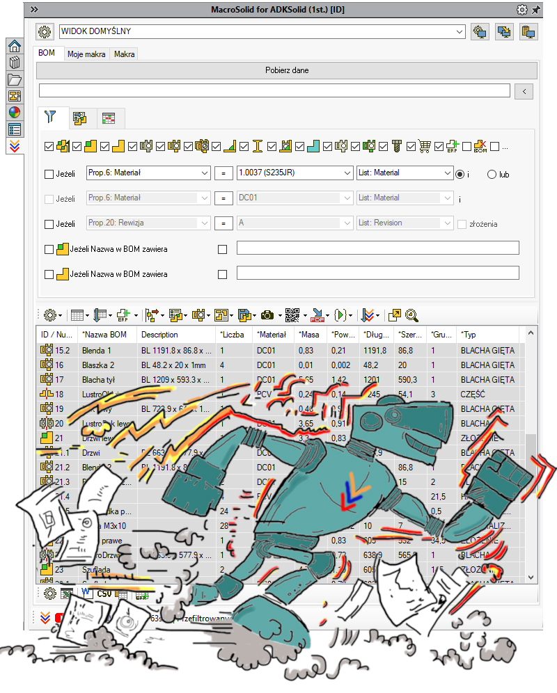Zdefiniuj właściwości plików, porządkuj drzewo FeatureManager, koloruj modele, generuj PDFy, DXFy, STEPy, podmieniaj formatki rysunkowe, drukuj ... w różnych trybach pracy z MacroSolid.