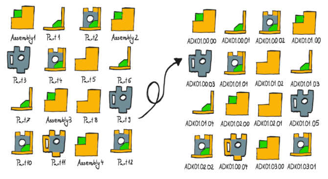 Wydaje się, że idealna sytuacja to taka, gdy podczas projektowania / przygotowania modeli 3D CAD konstruktor w ogóle nie myśli o nazwach pliku. Nazwy plików zazwyczaj są narzucane przyjętym w firmie schematem numerowania. Problem polega na tym, że podczas modelowania często zmieniamy strukturę drzewa złożenia, kolejność, dodajemy coś do zespołów konstrukcyjnych, usuwamy, przenosimy komponenty. Czyli tak naprawdę to dopiero na pewnym etapie przygotowania modelu jesteśmy w stanie przyjąć prawidłowe nazwy plików, kolejne numery.